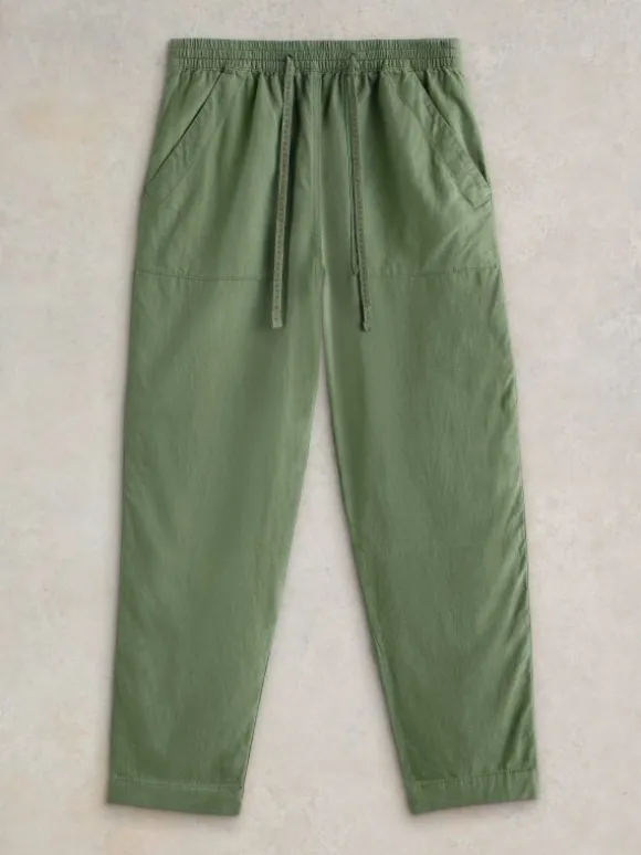 Ankle-length, linen-blend, tie-waist trousers (say that ten times fast). And they’re comfy. (Much easier to say.)