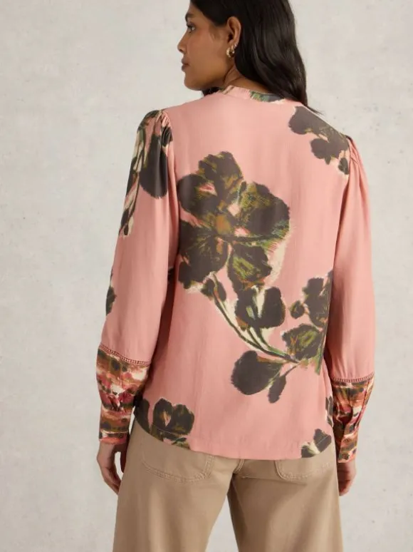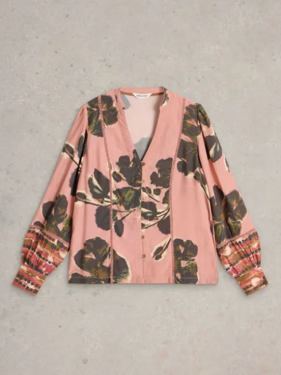 This top makes us think of fresh new flowers. Mixed with a sunrise. Spot the embroidery trims and laser printed pattern.