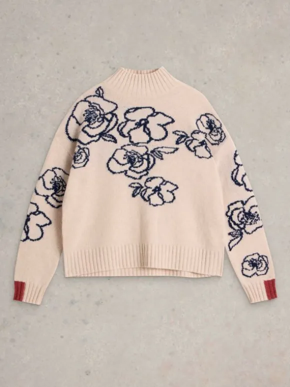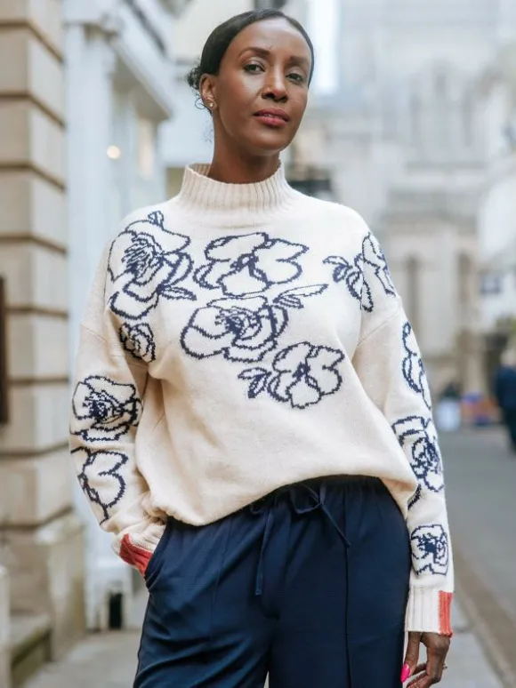 A jumper made with toasty lambswool. A high neck to snuggle into. Plus flowers that will last all season long.