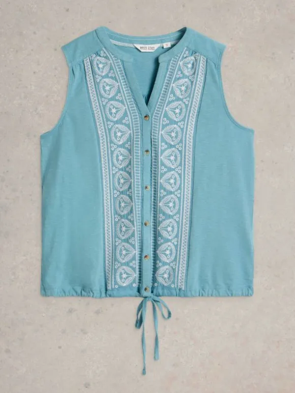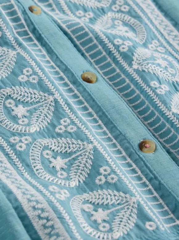 Summon the sun with this sleeveless shirt. (If it doesn’t work, you could always take it on holiday.) The tie detail and embroidery wouldn’t look out of place, that’s for sure.