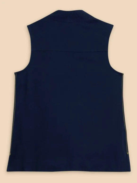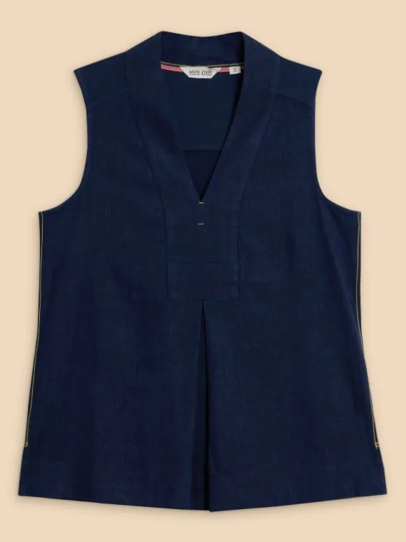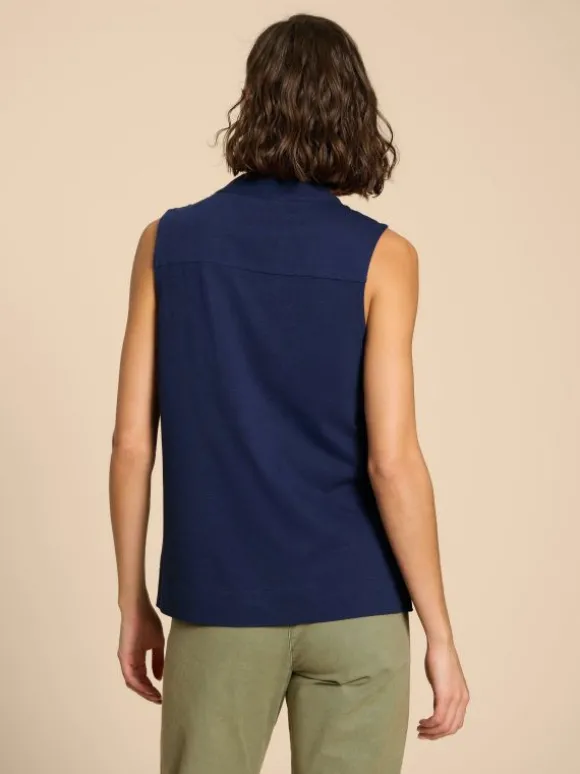 A sleeveless top that redefines the phrase ‘panel of experts.’ Because it’s got a woven front panel. And a jersey back panel. Included… expertly.