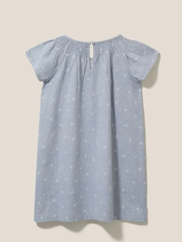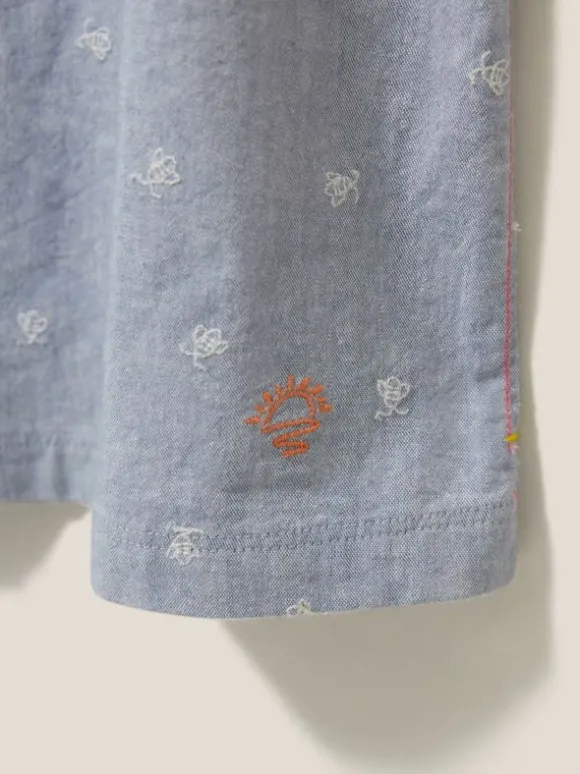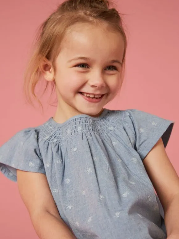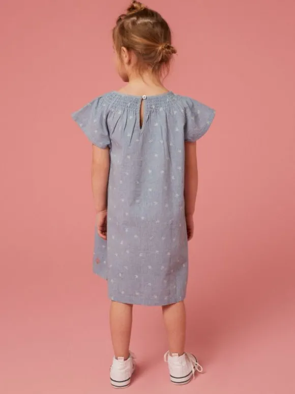 Lightweight chambray frills. Smocking. Adorable embroidery. We don’t think this dress could get any more summery.