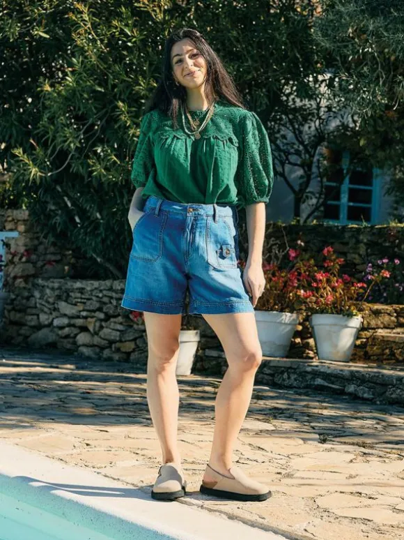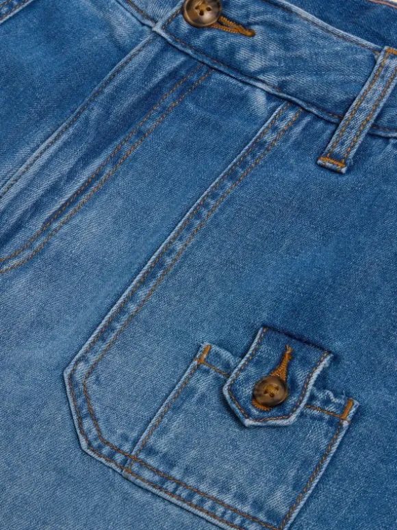 Our comfy combat shorts, now available in denim. And not just any old denim. (These are made with recycled cotton and linen.)