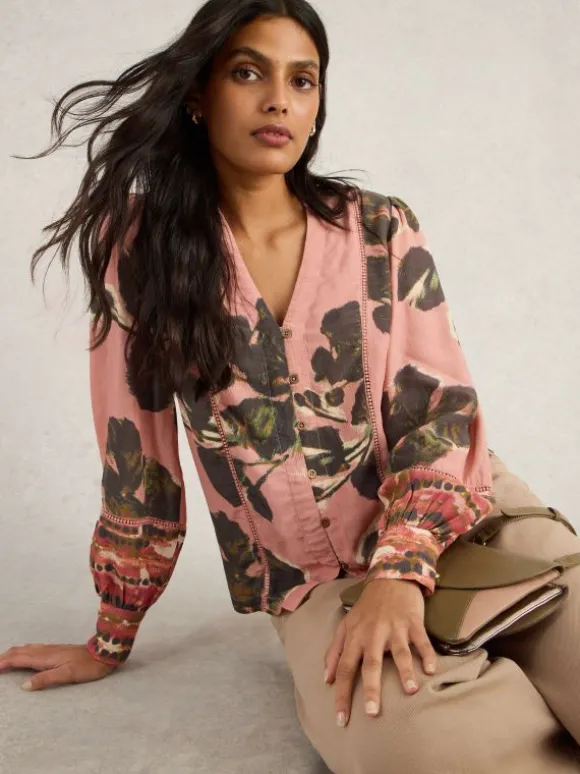 This top makes us think of fresh new flowers. Mixed with a sunrise. Spot the embroidery trims and laser printed pattern.
