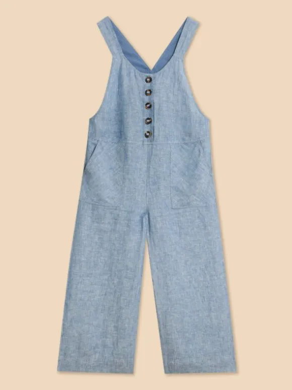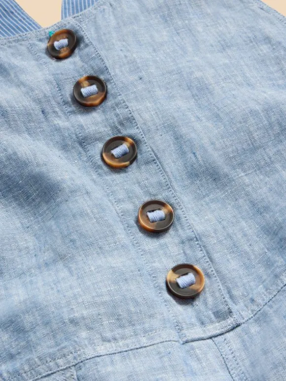 Linen dungarees with roomy pockets and statement buttons. Just add your favourite tee and a cool pair of kicks.
